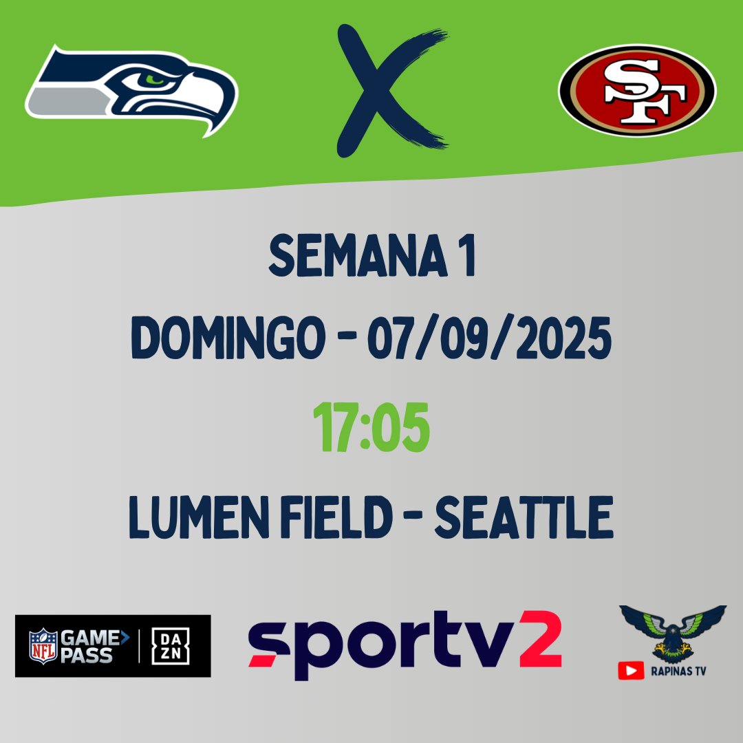 Seahawks e Rival de SF, Domingo, 17:05, Sportv2, Gamepass e Narração no YT do Rapinas do Mar.