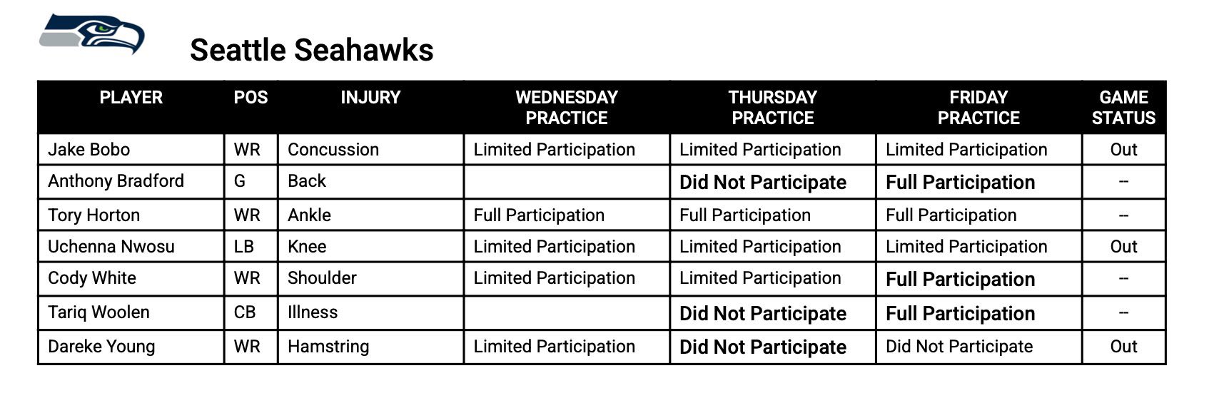 Nwosu que fez cirurgia e não participou da pré temporada, treinou limitado durante a semana, mas está fora, Jake Bobo idem, após concussão contra GB, Dereke Young completa a lista das ausências.